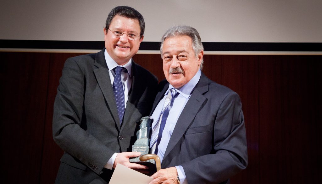 Fotografía: Pepe Sirvent recibiendo el 7 de abril de 2014 el galardón como Académico de Honor, de manos del en su momento Secretario General de la Academia de la Publicidad Enrique Yarza.